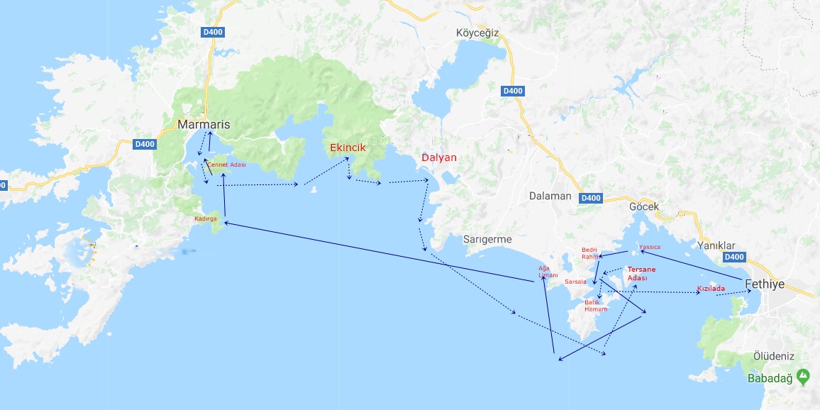 Marmaris, Ekincik Körfezi, Dalyan, Batık Hamam, Tersane Adası, Kızılada, Fethiye, Göcek Adası, Yassıca Adası, Bedri Rahmi Koyu, Sarsala, Ağa Limanı, Kumlubük Koyu, Cennet Adası, Marmaris